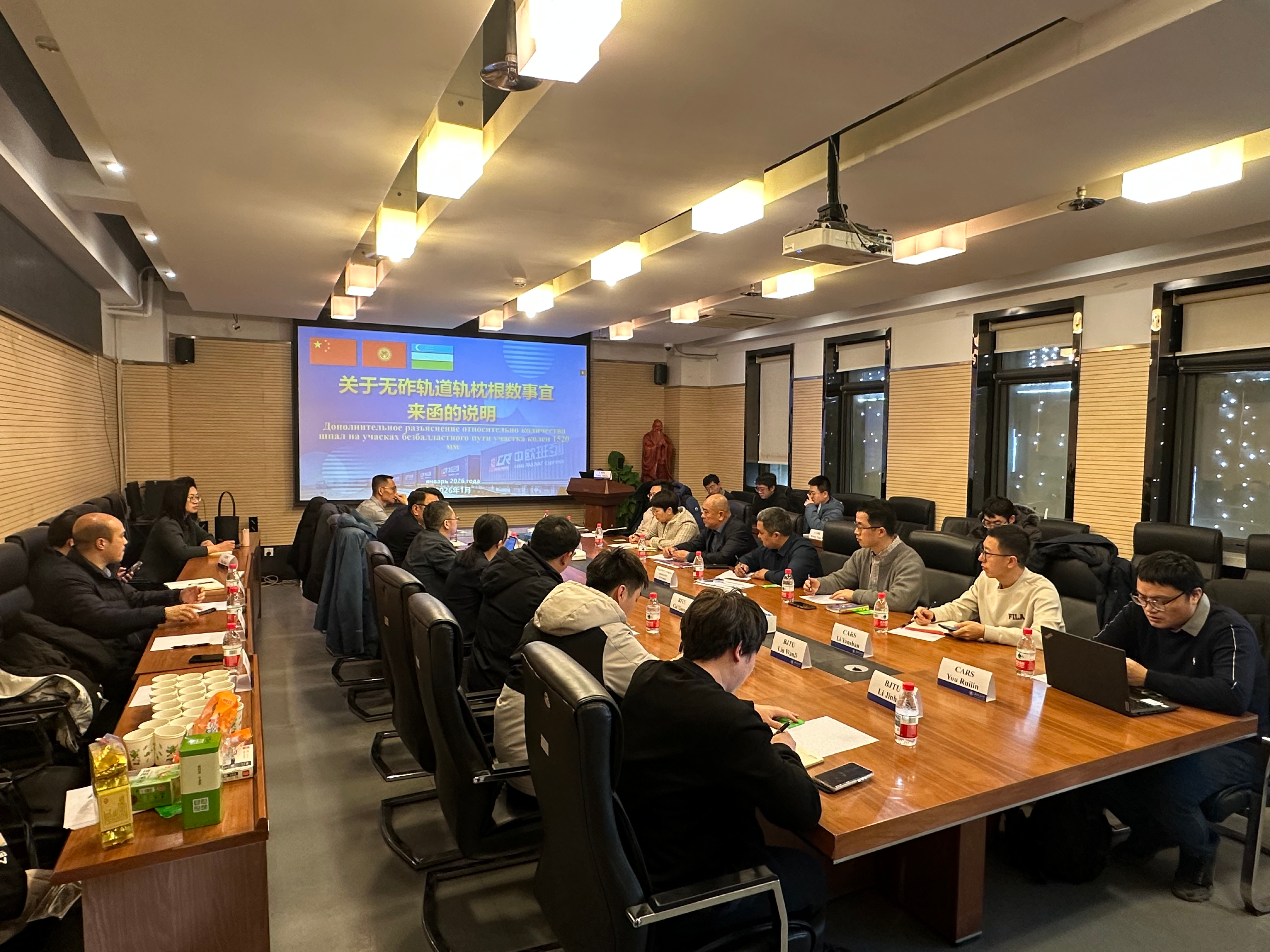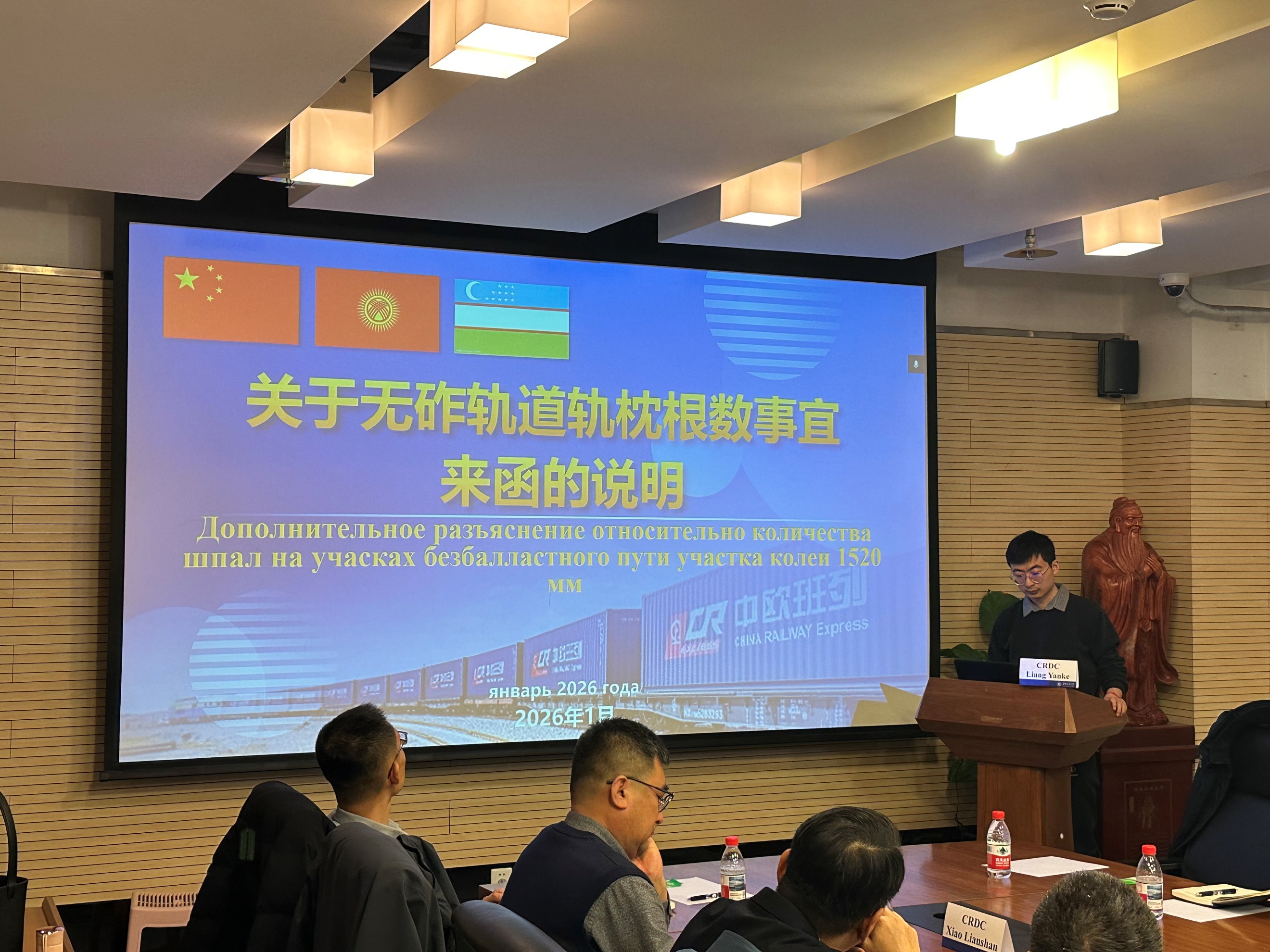 随后,中国铁设中吉乌铁路轨道专业负责人梁延科作了题为《p站无砟轨道轨枕根数事宜来函的说明》的专题汇报。汇报结束后,与会人员聚焦采用中国无砟轨道标准体系核心议题,围绕相较于吉尔吉斯斯坦现行标准进行轨枕根数优化调整后,轨道结构的受力性能变化、长期运营安全性以及全生命周期经济性测算等关键问题,展开了深入、务实且富有建设性的技术讨论。会议现场交流充分,讨论热烈,为推进中吉乌项目技术方案的进一步优化与共识的形成奠定了坚实基础。